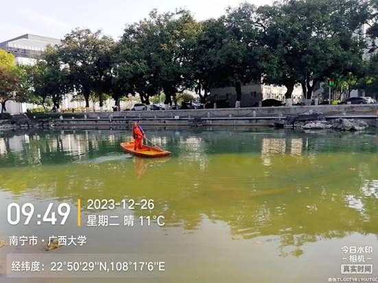 持续做好16个景观湖和4个景观池的湖水治理工作,湖泊运维员每日打捞湖面垃圾并清理大面积油膜,防止堆积,做到水面干净整洁;控鱼常态化进行,捕获杂鱼总计21斤;各湖驳岸清理螺蛋、打捞福寿螺约160斤;大碧云湖、翠湖、鉴湖和彩蝶湖裸露区域补种水草;对大碧云湖,紫荆湖中段补水约500m³,鉴湖,镜湖补水约900m³;春华湖,秋实湖补水约400m³;彩蝶湖南段、鉴湖蓝绿藻治理作业;莲湖、爱莲湖水草病虫害治理、水草养护;鉴湖北段进行三轮水体治理,已完成,水体透明度恢复清澈见底;月牙湖、爱莲湖和紫荆湖驳岸花带、杂草进行清理修剪;小碧云湖、荷湖修剪过密睡莲和养护荷花藕根;彩蝶湖北段、翠湖、爱莲湖水草施肥养护。16个景观湖和4个景观池总计清运垃圾7吨。