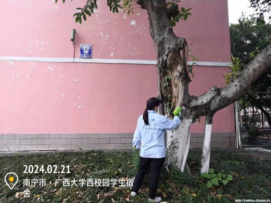 树枝修剪:主要对东校园东区20栋、西校园北区7栋、35栋、西校园北区博士楼、西校园中区2、11栋、西校园西区6栋、11栋、东门、北门、东高住宅楼、育才广场、碧云路、君武路、崇文路、工厂路、外培楼、校办、南大门、东校园西区13栋、鸪江路、蝶山路、碧云湖、西校园中区11栋、一幼、木工厂路、崇左路、学生公寓南区、大礼堂、中轴线、行健学院、动物医院、六教周边、碧云湖、农学院、新东园、通和路、沙塘路、农场路、学生公寓29栋至30栋等区域的枯技、断枝和危树死树进行处理,对靠近建筑物及电线、路灯、摄像头等设施的树枝和低枝进行修剪,清除兔丝子等寄生植物。