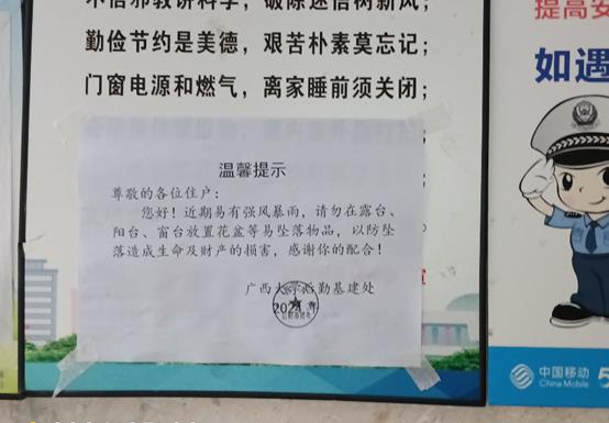 本周对教职工住宅区公共区域的路灯、盖板等水电设施进行巡查及维修;对服务范围内的管道进行疏通工作;每天24小时持续进行接听、报修和回访电话;配合学校水电改造工程按照规定完成上门抄写水电表工作,并按计划上门或电话进行水电费欠费催缴工作。本周处理教职工住宅区、公共区域报修共172单;完成228栋教职工住宅楼的日常保洁与消杀工作;清理教职工住宅区公共区域杂物17处,并对乱堆乱放的杂物或建筑垃圾等不能立即解决的张贴书面整改通知书限期整改。针对强风暴雨天气,对教职工及住户进行温馨提示检查阳台、窗台及楼顶天台等处,有无摆放易坠危险品,将花盆及可能被风吹走的物品移回室内。