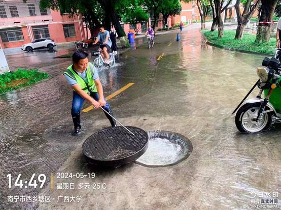 本周继续做好各公共区域环境卫生进行日常清扫保洁工作。本周有红色暴雨和雷电黄色预警,环境办和物业公司继续启动应急预案,全面实行暴雨应急措施。针对校园内可能出现内涝的区域及桥梁下方加大排险巡查力度,对可能导致排水受阻的雨水井和雨篦子表面垃圾进行清理,保持排水系统畅通,并准备好抽水泵、排水管及沙袋,以便防汛工作需要时能随时启用,雨后迅速组织人员排涝,清理校园内的积水、落叶和废弃物等,确保校园环境的安全,以及行人及车辆的顺利通行。