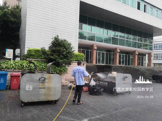 垃圾清运:按规定时间、路线清运校园垃圾,做到垃圾日产日清,并对垃圾桶和勾臂箱进行清洗和消杀。本周清运生活垃圾348.2吨,大件垃圾11.5吨,绿化垃圾42.7吨。