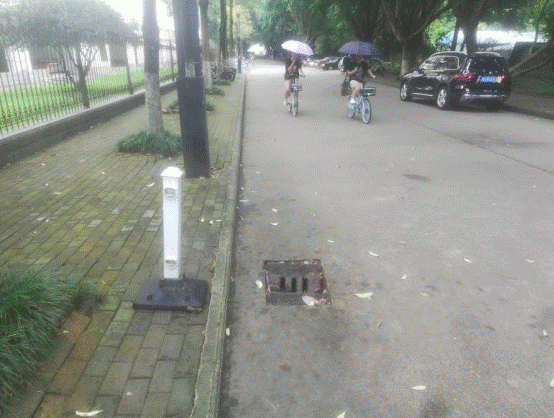 行健学院大门右侧路口井盖断裂修复前