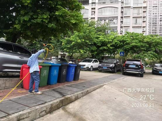 垃圾清运:按规定时间、路线清运校园垃圾,做到垃圾日产日清,并将垃圾分类回收至垃圾中转站进行除臭处理。同时对垃圾桶、箱及周边进行定期清洁冲洗及消毒,减少细菌的滋生,避免出现垃圾桶、箱异味现象。