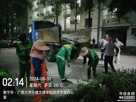8月30日至31日,环境办和博世科物业接到紧急任务,在保证校园公共区域环境卫生保洁日常作业的同时,全力以赴加班加点支援北校区学生公寓装修后的卫生保洁工作,分批次对北校区学生公寓楼及公寓楼内庭、外围进行保洁、建筑垃圾清运等工作。30日晚上环卫保洁员工加班至第二天凌晨4点钟,圆满完成支援工作。