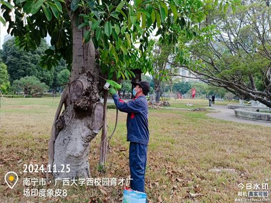树木修剪:对动物医院、东高3栋、林学院、北校园学生公寓、北校园教学楼、西校园北区36栋、林学院北面、荟贤路、东校园西区8栋、东校园学生公寓、生科院、碧云湖西面、西校园中区6栋、木工厂路等区域进行枯枝处理,对树木低枝、寄生枝和靠近电线、建筑物、路灯及摄像头等设施的树枝进行修剪。