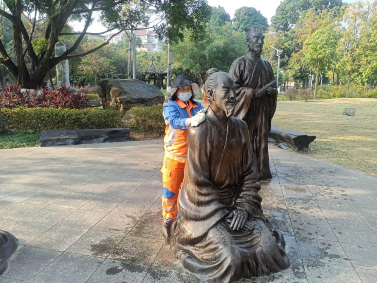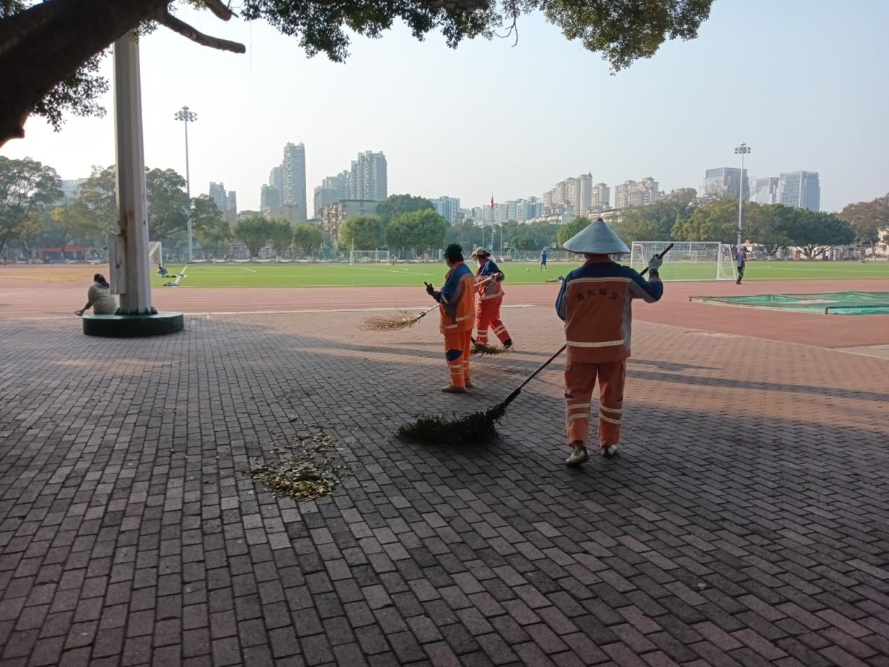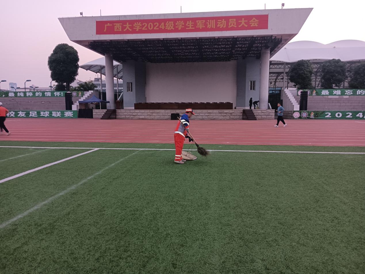 环卫保洁人员继续做好校园各区域环境卫生清扫保洁工作,每日清晨五点半开始采用“人机结合”的方式清扫校园的各大校道及支道,日常及时清理绿地枯枝落叶和白色垃圾,清洗铜像、果皮箱、清理水沟、雨篦子等,保持校园环境干净整洁。环卫保洁总面积近80万㎡,人均保洁6800㎡。本周还做好广西大学2024级学生军训动员大会等活动的环境卫生保障工作。