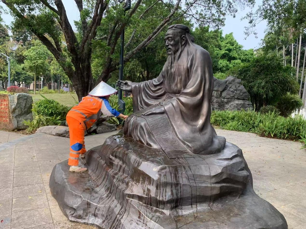 本周环卫保洁人员继续做好校园各区域环境卫生清扫保洁工作,每日清晨五点半开始采用“人机结合”的方式清扫校园的各大校道及支道,日常及时清理绿地枯枝落叶和白色垃圾,清洗铜像、果皮箱、清理水沟、雨篦子等,保持校园环境干净整洁。环卫保洁总面积近80万㎡,人均保洁6800㎡。
