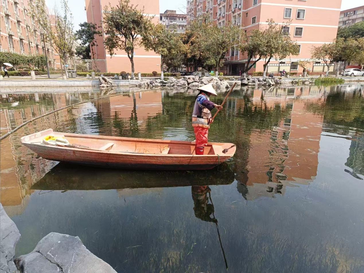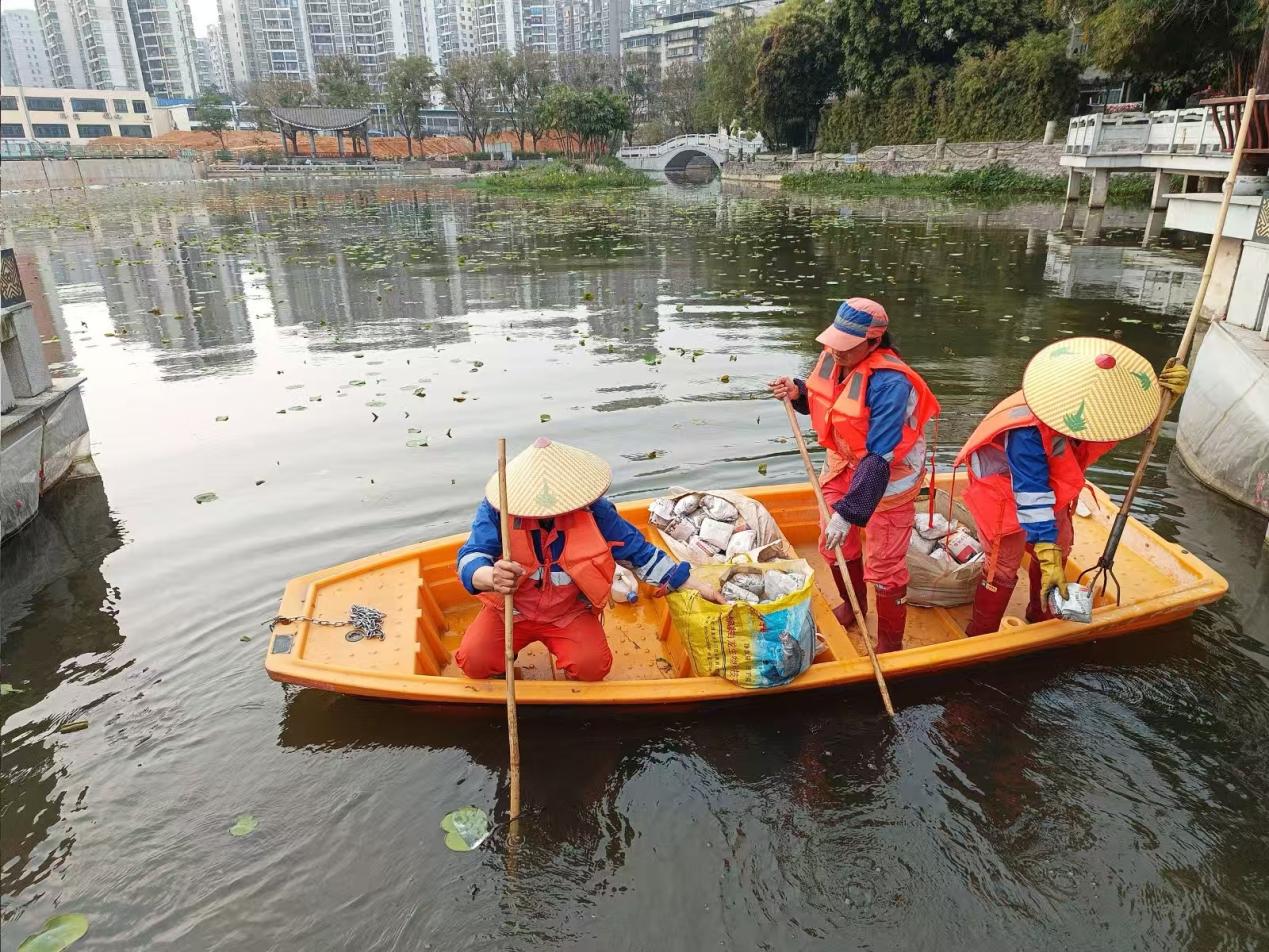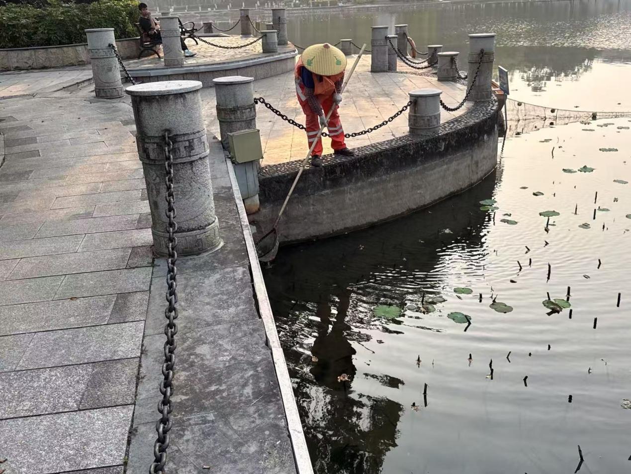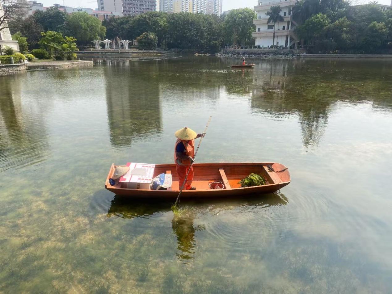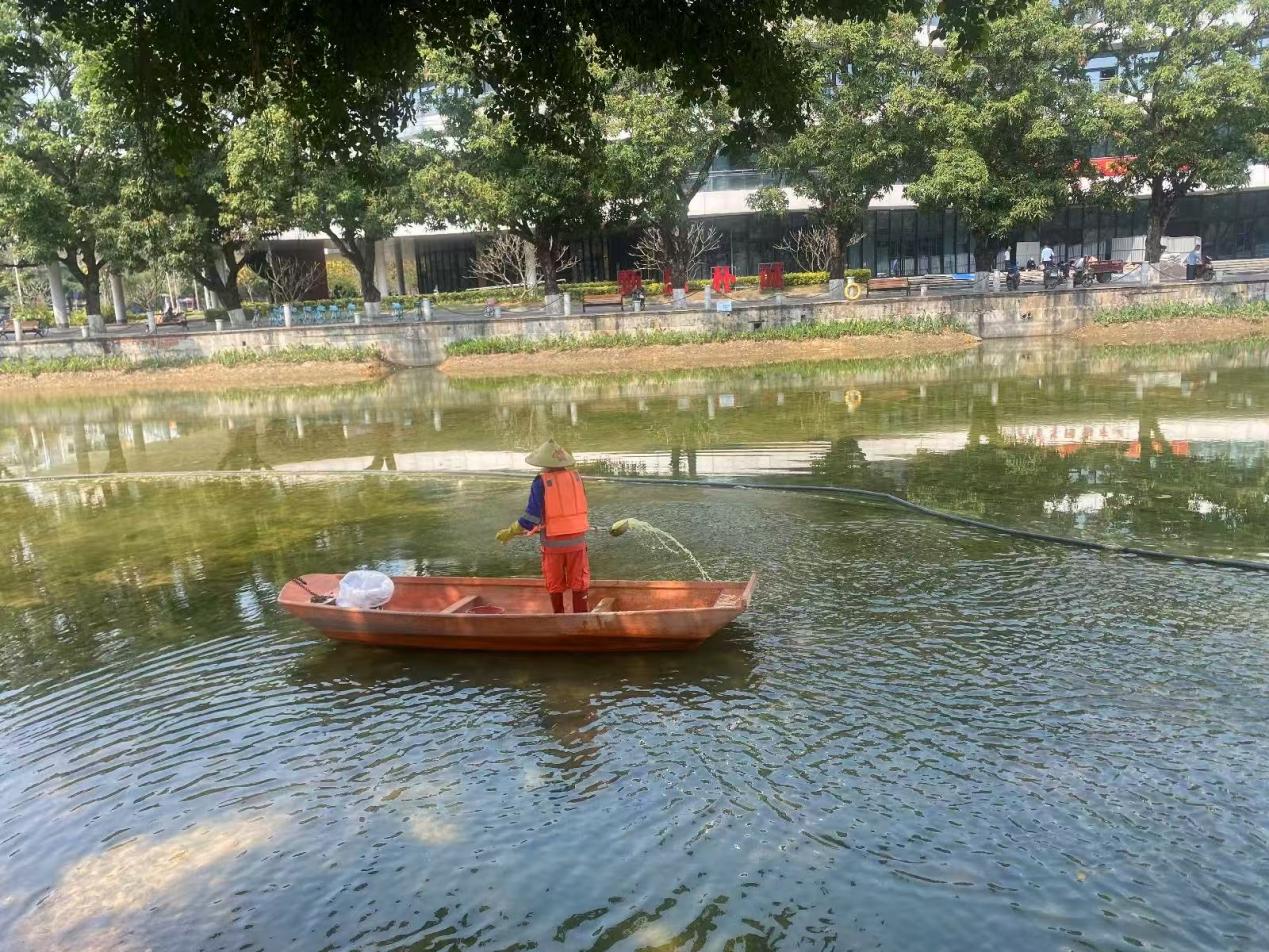 湖泊运维员每日进行湖面保洁、湖面油膜垃圾清理,保持水面干净整洁:对镜湖、鉴湖、翠湖、荷湖、莲湖、爱莲湖、彩蝶湖、大碧云湖、月牙湖、紫荆湖花带修剪;对镜湖、鉴湖、翠湖、春花湖、秋实湖、莲湖、荷湖、爱莲湖、彩蝶湖、大碧云湖、小碧云湖、观月湖、绿榕湖进行打捞青苔;对荷湖、莲湖、小碧云湖、春华湖、秋实湖、翠湖、彩蝶湖进行青苔治理;莲湖、鉴湖、秋实湖、翠湖荷花区施肥;对秋实湖、爱莲湖假山池、劝学岛景观池、大碧云湖、小碧云湖、紫荆湖中段、南段进行补水;因紫荆湖大部分区域已干涸裸露泥床,本周继续对泥床注水湿润及沿岸水生植物进行淋水;汇学堂景观池、四教景观池打捞保洁。