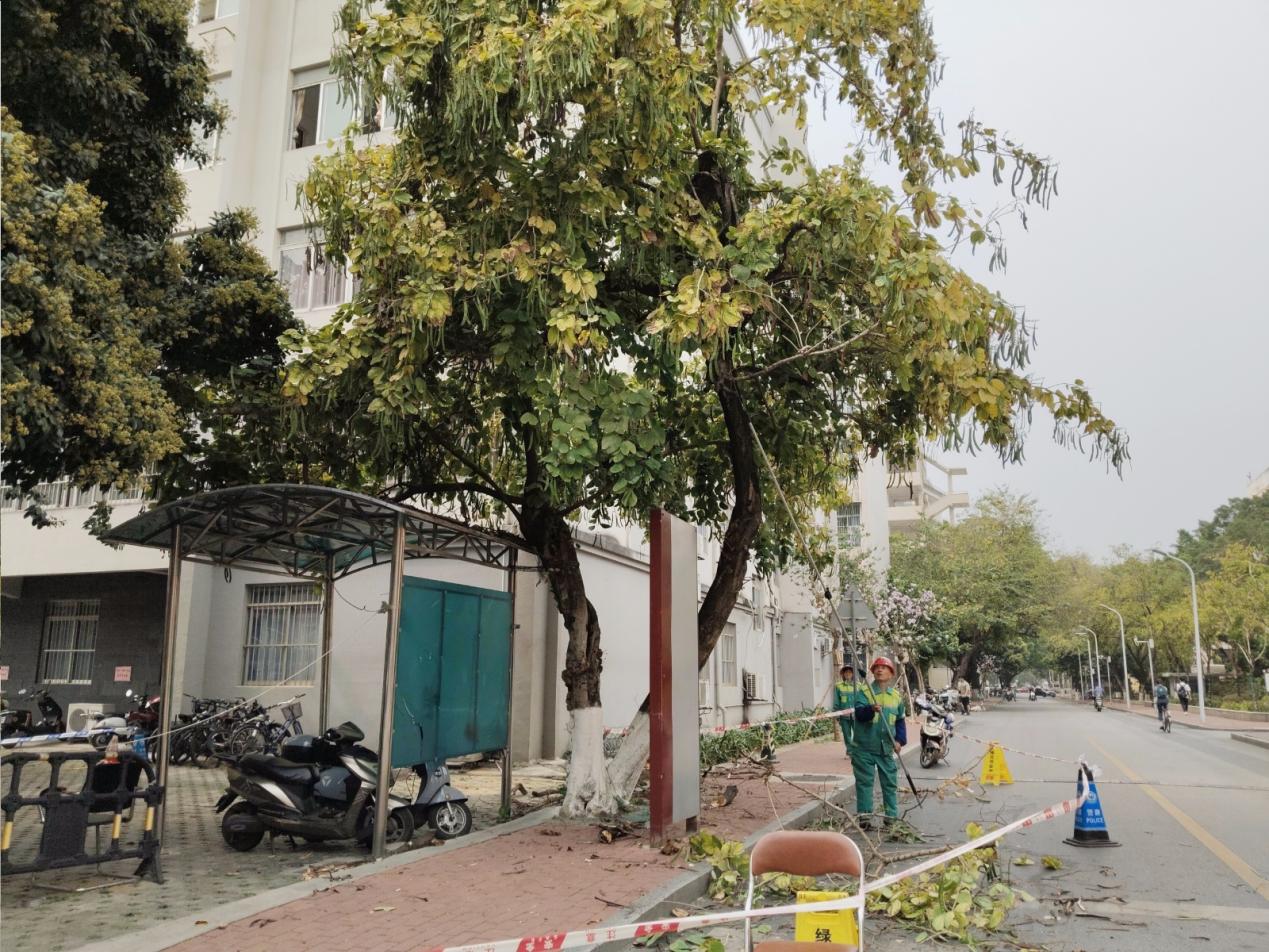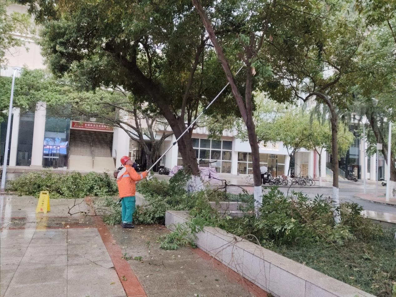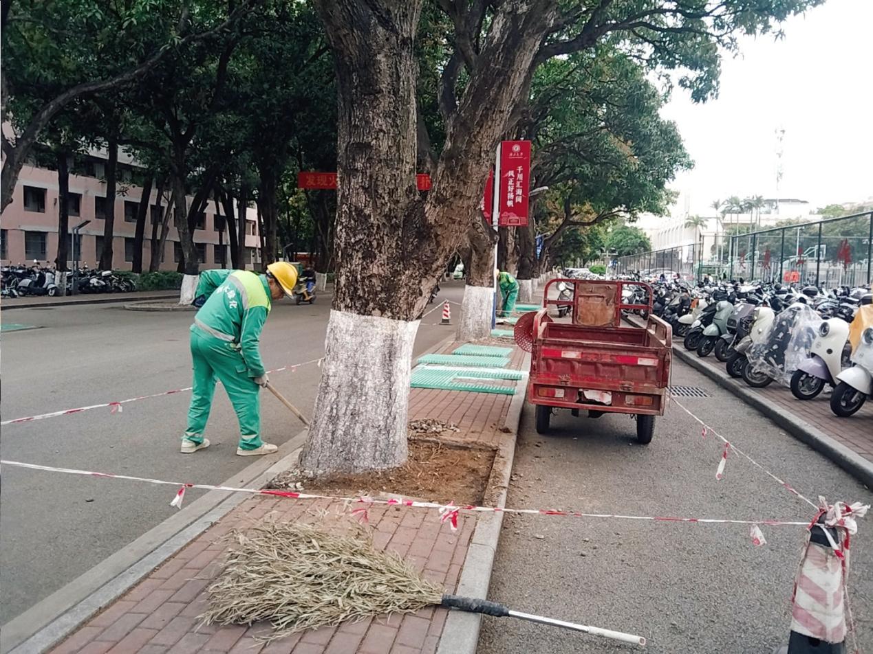 树木修剪:崇文路、熊猫园、君武路、蝶山路、六教、农场路、农学院北面、时光广场、大礼堂、学生公寓6B栋、东校园东区14至20栋、劝学岛、东体育场、法学院、东校园中区23栋、中转站假植地、新东园、北校园、西校园北区20栋、育才广场、工厂路、学生公寓30栋、中轴线、办公楼、学生公寓6B栋、碧云湖、汇学堂等区域进行枯枝处理,低枝、侧枝、寄生树和靠近电线、建筑物、路灯及摄像头等设施的树枝进行修剪。