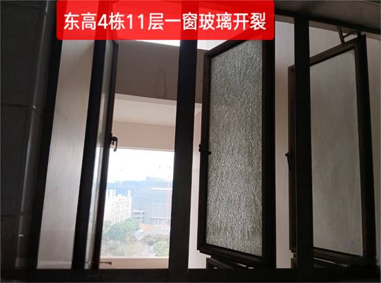东高4栋11层窗户玻璃破裂修复前