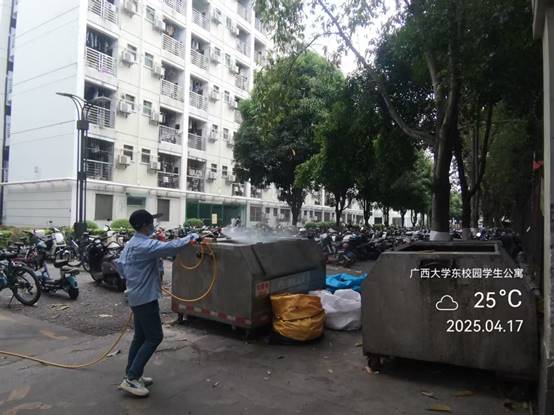 垃圾清运:按规定时间路线清运校园垃圾,做到垃圾日产日清,并对垃圾桶和垃圾箱进行清洗和消杀。本周清运生活垃圾376.2吨,大件垃圾10.8吨,绿化垃圾190立方。