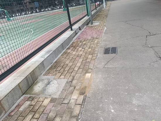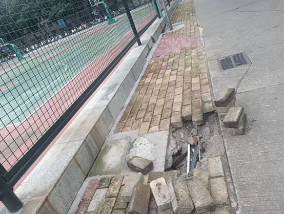 东校园篮球场围栏旁地砖破损修复前
