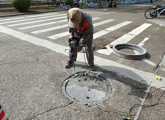公共区域维修板块继续做好校内公共区域地面、路沿石、路灯、水沟盖板、健身器材等设施排查、维修、抢修工作;及时对校内雨篦子、井盖、管道等排水系统进行排查、疏通。本周对校内公共区域道路路面、路灯、盖板等维修共21处,排水口疏通28次。