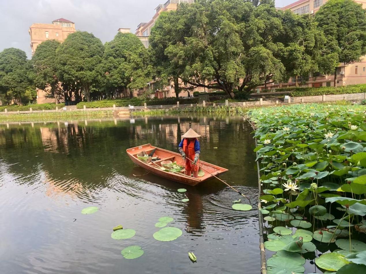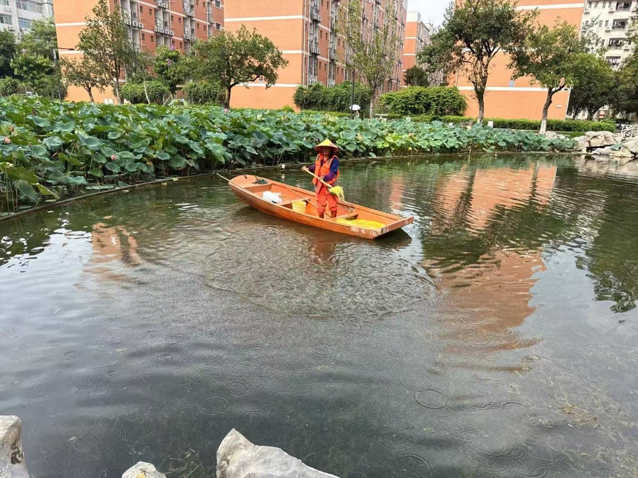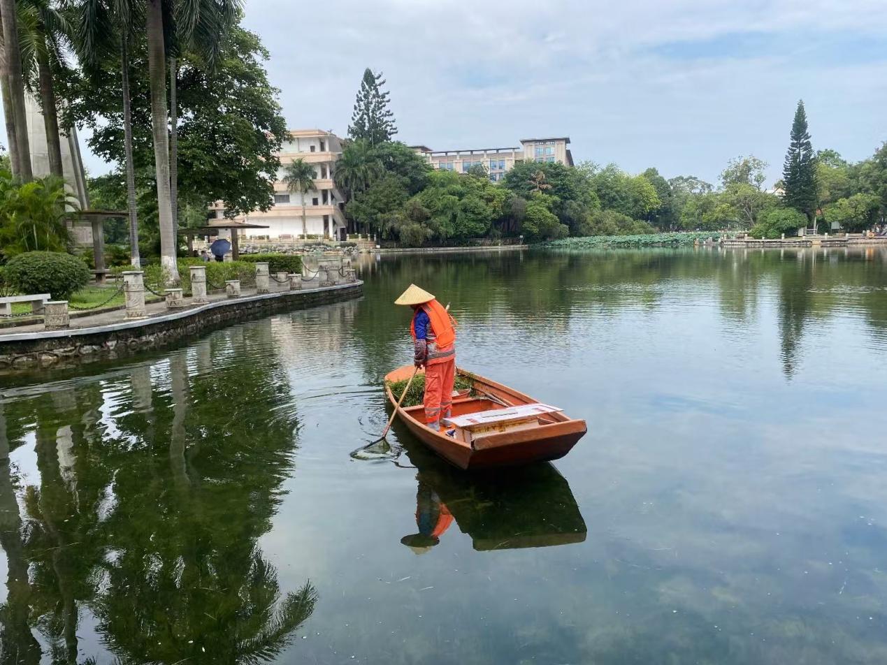 湖泊运维员每日进行湖面保洁、清理湖面油膜垃圾,保持水面干净整洁;对镜湖、鉴湖、翠湖、荷湖、莲湖、爱莲湖、彩蝶湖、大碧云湖、月牙湖、紫荆湖等湖泊驳岸花带修剪;镜湖、鉴湖、翠湖、春花湖、秋实湖、莲湖、荷湖、爱莲湖、彩蝶湖、大、小碧云湖、观月湖、绿榕湖进行青苔打捞;对秋实湖、西校园假山水池、汇学堂景观池、四教景观池打捞保洁,修剪观月湖、鉴湖、荷湖、莲湖、小碧云湖、大碧云湖枯萎荷叶,各湖病虫害防治,小碧云湖、鉴湖水草修剪,翠湖、月牙湖补种水草。