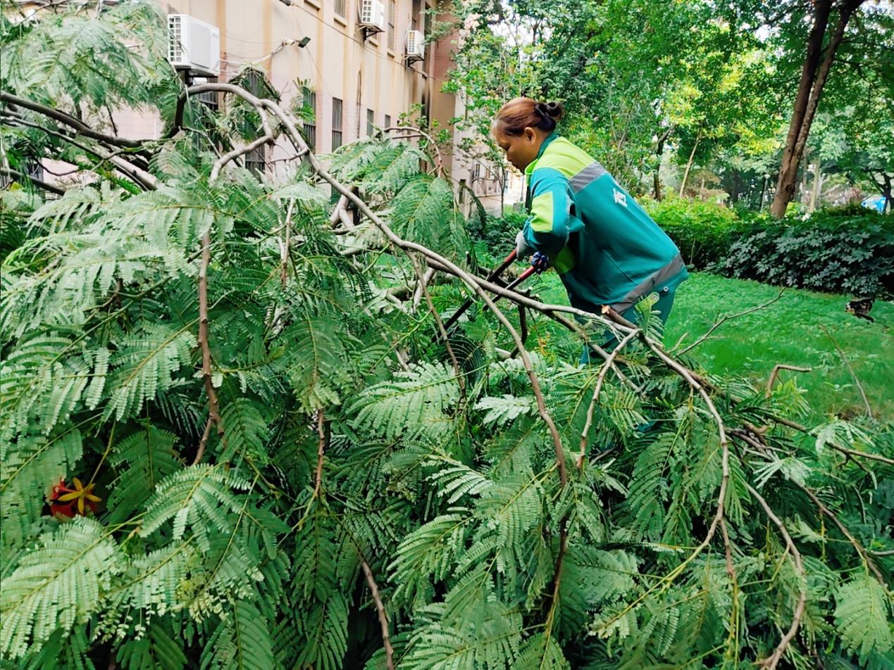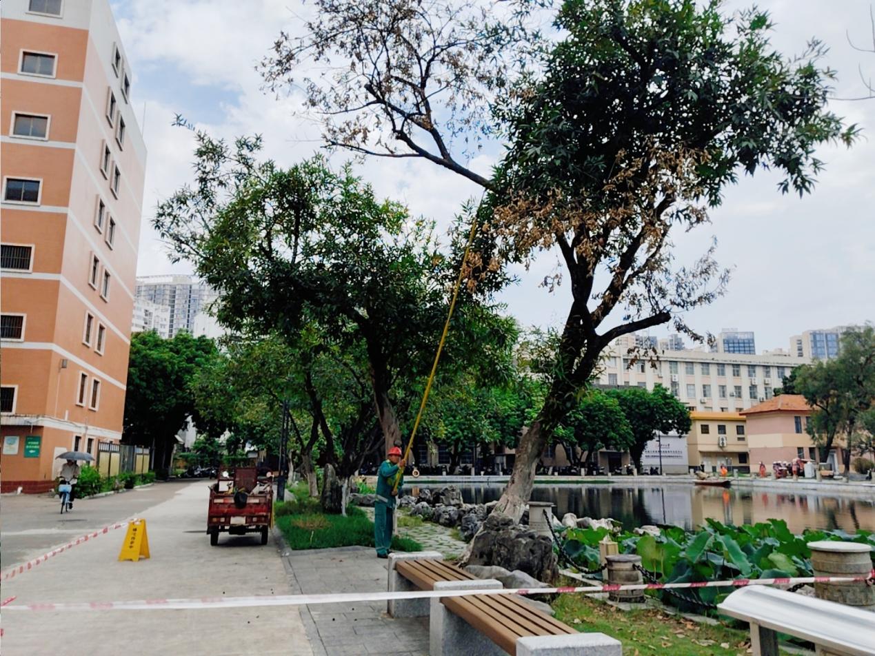 树木修剪:化工学院、君武馆西面、校办南面、数信学院东面、分析测试中心停车场、崇文路、财务处停车场、三教、保卫处、经济学院、汇学堂、物理学院、北校园、东门、林学院、新东园、东校园中区23栋、农场路、东校园东区14栋、十教、图书馆、艺术学院北面、东高停车场、东校园西区6栋、木工场路、劝学岛等区域进行枯枝处理、雨后断枝处理、低枝、侧枝、寄生树和靠近电线、建筑物、路灯及摄像头等设施的树枝进行修剪。