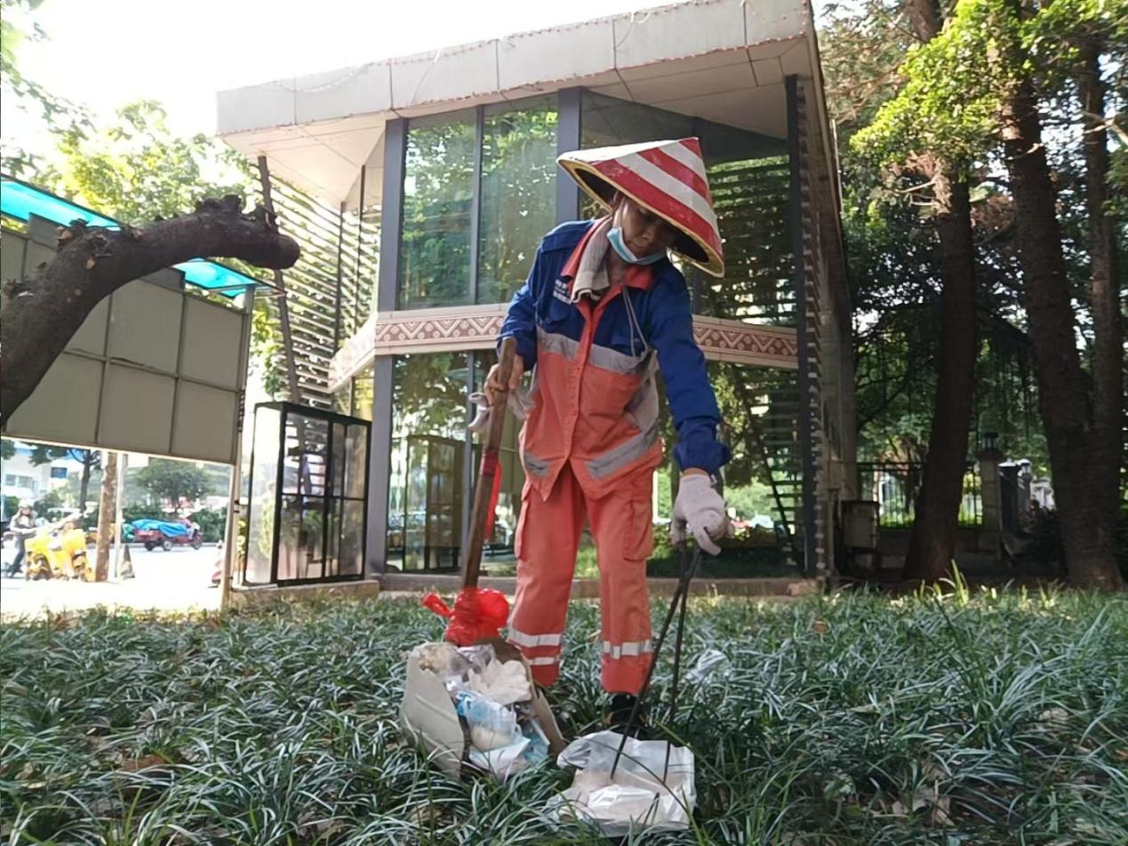 南门绿化带捡拾白色垃圾