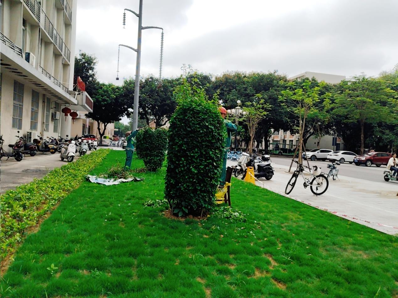 绿地日常养护工作:对熊猫园、大礼堂、西体育馆、学生公寓12栋、20栋、办公楼、荷湖、育才广场、南大门、汇学堂、校办、莲湖、西校园西区、博萃桥、学生公寓12栋、北校园围墙、东校园西区4栋、碧云湖、艺术学院、图书馆南面、六教、生科院、经济学院、时光广场、劝学岛新东园等区域草坪修剪、绿篱修剪、病虫害防治消杀、松土、施肥、淋水、菟丝子清理等养护工作。