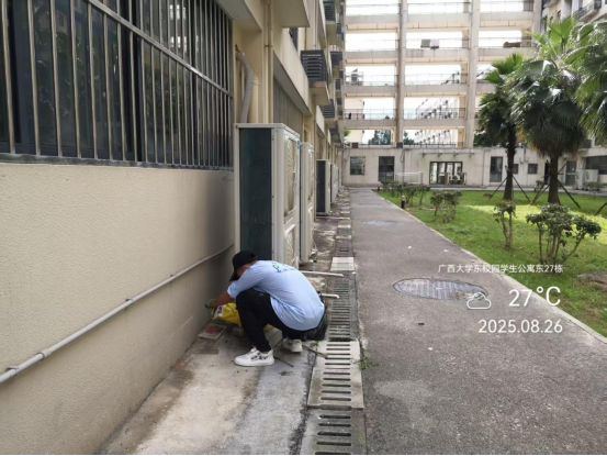 暑期继续做好校内公共区域地面、路沿石、路灯、水沟盖板、健身器材等设施排查、维修、抢修工作;及时对校内雨篦子、井盖、管道等排水系统进行排查、疏通。对校内公共区域道路路面、路灯、盖板等维修共302处,排水口疏通175次。