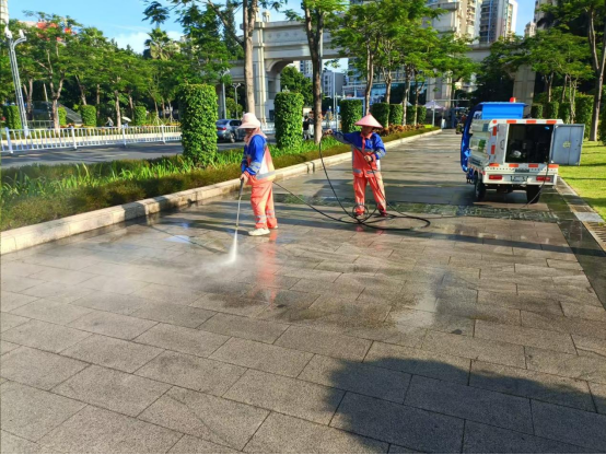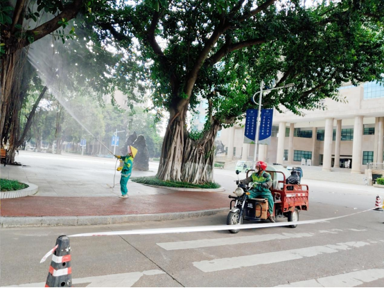 暑假期间,环卫保洁人员继续做好校园各区域环境卫生清扫保洁工作,每日清晨五点半开始采用“人机结合”的方式清扫校园各大校道及支道,日常及时清理绿地枯枝落叶和白色垃圾,清洗铜像、果皮箱、清理水沟、雨篦子等,保持校园环境干净整洁。环卫保洁总面积近80万㎡,人均保洁6800㎡。