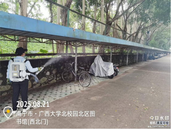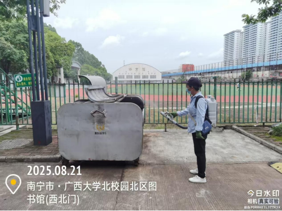同时,为迎接2025秋季开学,保持良好的校园卫生环境,病媒生物防制板块于8月18日起至9月6日对东、西校园和行健文理学院的教学办公区、教职工住宅区、学生公寓区等外环境实施新一轮灭鼠杀虫、白蚁、红火蚁等病媒生物防制工作。防制范围包括所有的教学楼、办公楼、教职工住宅楼、食堂、农贸市场、医院、科研基地、仓库等外环境以及校园的主次干道的下水道口、公厕、垃圾桶(箱)、绿化带、雨水沟等,实际有害生物防制面积约136万㎡。其中绿地30多万㎡,下水道、化粪池及各类地井约3500个、小型污积水体约1万㎡,防制的主要内容包括对上述区域外环境的鼠、蚊、蝇、蟑螂等病媒生物及红火蚁、白蚁进行有效防制。
