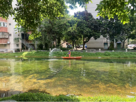 湖泊运维员每日进行湖面保洁、湖面油膜垃圾清理,保持水面干净整洁:对小碧云湖、大碧云湖、莲湖、翠湖、彩蝶湖、鉴湖、镜湖水草修剪;对彩蝶湖、爱莲湖、翠湖水草裸露区域进行补种;对大碧云湖、镜湖、鉴湖、月牙湖、绿榕湖进行水质调理;打捞青苔;对西校园体育场西北角假山景观池、汇学堂周边景观池、劝学岛景观池进行清淤冲洗;