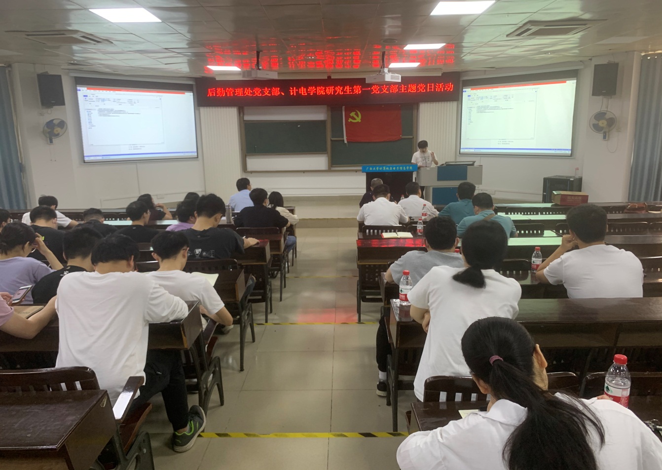 4月28日上午,后勤管理处党支部、计算机与电子信息学院研究生第一党支部在计算机与电子信息学院214报告厅联合开展主题党日活动,共40多名党员参加了本次活动。