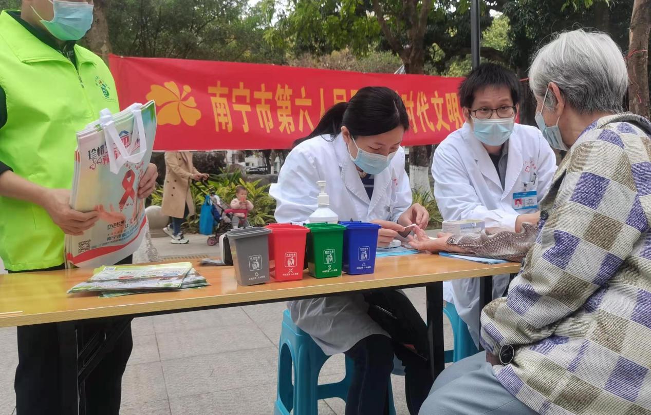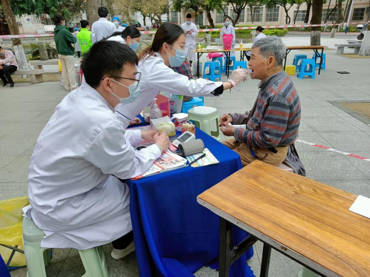 送健康:志愿者及第六人民医院医护人员为教职工300余人提供了测血压、测血糖、牙科、疾病预防知识普及等医疗公益服务。