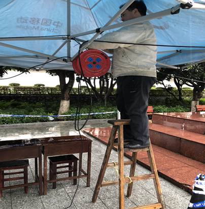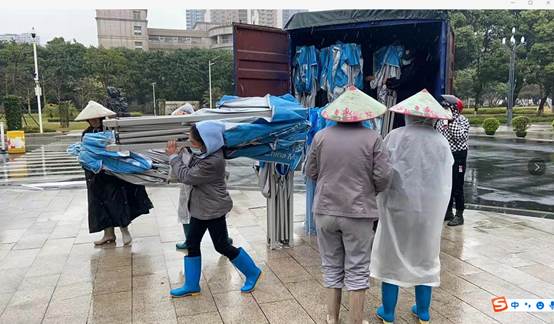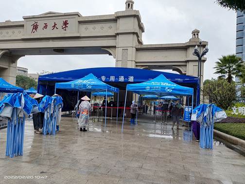 2月20日,周日。一场二月同期罕见的寒潮肆虐邕城,春寒料峭,校园内气温仅4度,不间断的中雨,空气相对湿度95%。这本该是家人围炉避寒的日子。但后勤管理处广大职工在接到做好迎接学生返校准备工作的紧急通知后,立即行动起来,放弃周末假期,在处领导的统一部署调配下,开展学生返校前的各项后勤保障工作。我校2月21日起至3月4日学生将陆续错峰返校,根据疫情防控要求,在校南大门和东门需搭建两条由帐篷连接起来的学生返校专用通道,两个核酸检测点、临时观察点的帐篷搭建和接待区桌椅的摆放等。后勤管理处的同志和物业公司的员工一起将一车车满满的帐篷桌椅搬运过来,冒着寒风在雨中装卸和搭建。经过4个多小时的忙碌,校南门和东门学生返校专用通道和两个核酸检测点的帐篷搭建完毕。接下来水电安装师傅立即进场进行学生返校专用通道和核酸检测点的水电安装,拉线、布线、安装灯具、插座。在冷风冷雨中,师傅们干得热火朝天,仿佛忘记了南宁罕见的4度的天气。