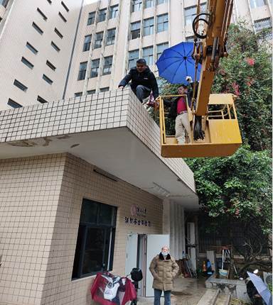 以此同时,后勤管理处的其他工作也在有条不紊的进行当中,设备维修、环卫保洁、环境消杀等。连日来的阴雨天气,使得部分建筑物的屋顶漏水,维修师傅也在冒雨抢修。