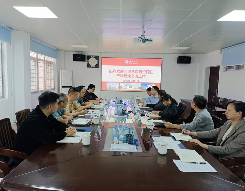 4月11日下午,河池学院后勤管理处(基建处)副处长蓝凛一行6人到我处调研交流。会议由太阳集团tyc138党委副书记、纪委书记、副处长袁荣卿主持。