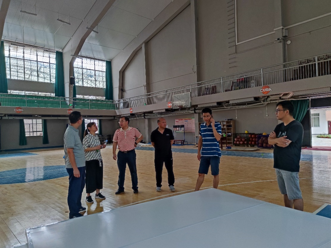 在西校园篮球馆、体操馆检查天面安全隐患排除项目的推进情况,现场指导和协调材料选定、工程进度等工作,推进体育场馆按要求如期完成整改。