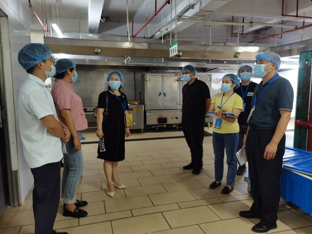 检查组听取资产经营有限公司关于全校食品安全自查情况汇报,深入学校食堂、菜市场、商铺、超市、附属中学、君武小学、第一幼儿园、第二幼儿园开展食品安全现场检查。