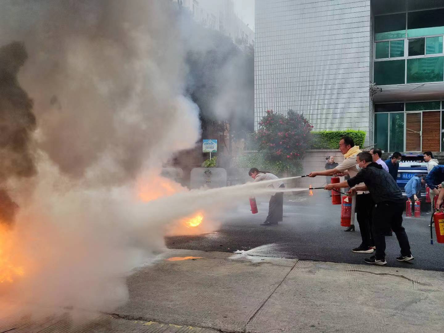 在学习灭火器的使用方法后,每位教职工都亲自操作灭火器,进行消防灭火演练。