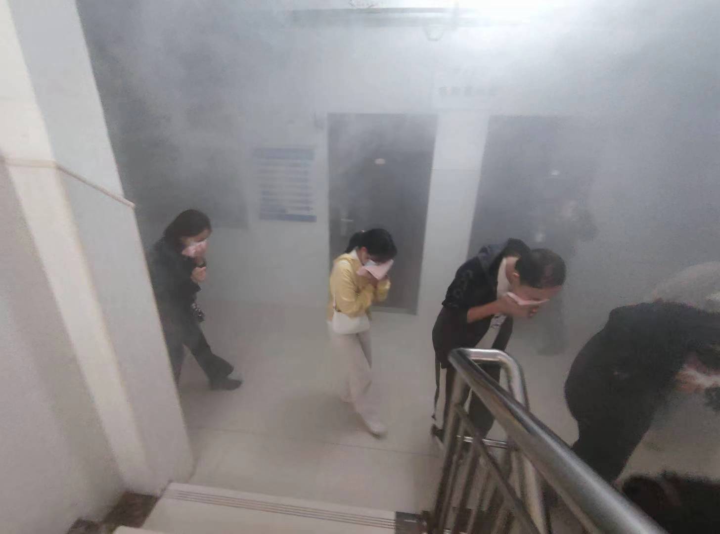 在火灾疏散逃生演练环节,保卫处的专业人员指导教职工开展模拟火灾逃生演练。演练现场,烟雾弥漫,警报声响起,教职工们迅速用湿毛巾捂住口鼻,弯腰低姿,按照预定的逃生路线迅速撤离到指定场地集合。整个演练过程紧张有序,教职工们积极配合,达到预期演练效果。